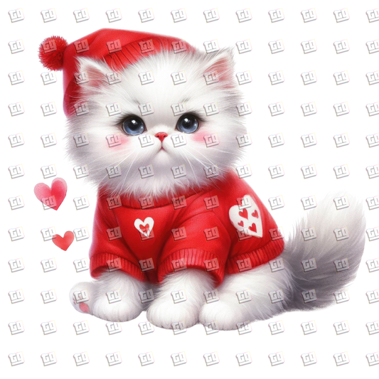 White Kitten With Red Hat and Sweater- Valentines - DTF Transfer